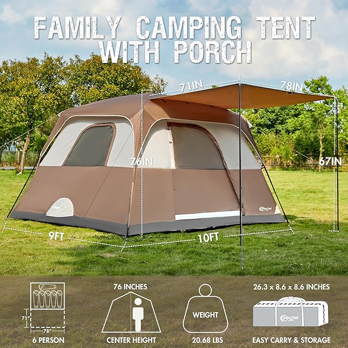 PORTAL 6 | 8 | 10 Person Family Camping Tent with Porch, Big Family Camping Tent with Tall Height, Good Ventilation, Water Resitant Large Tent for Outdoor Camping, Backyard