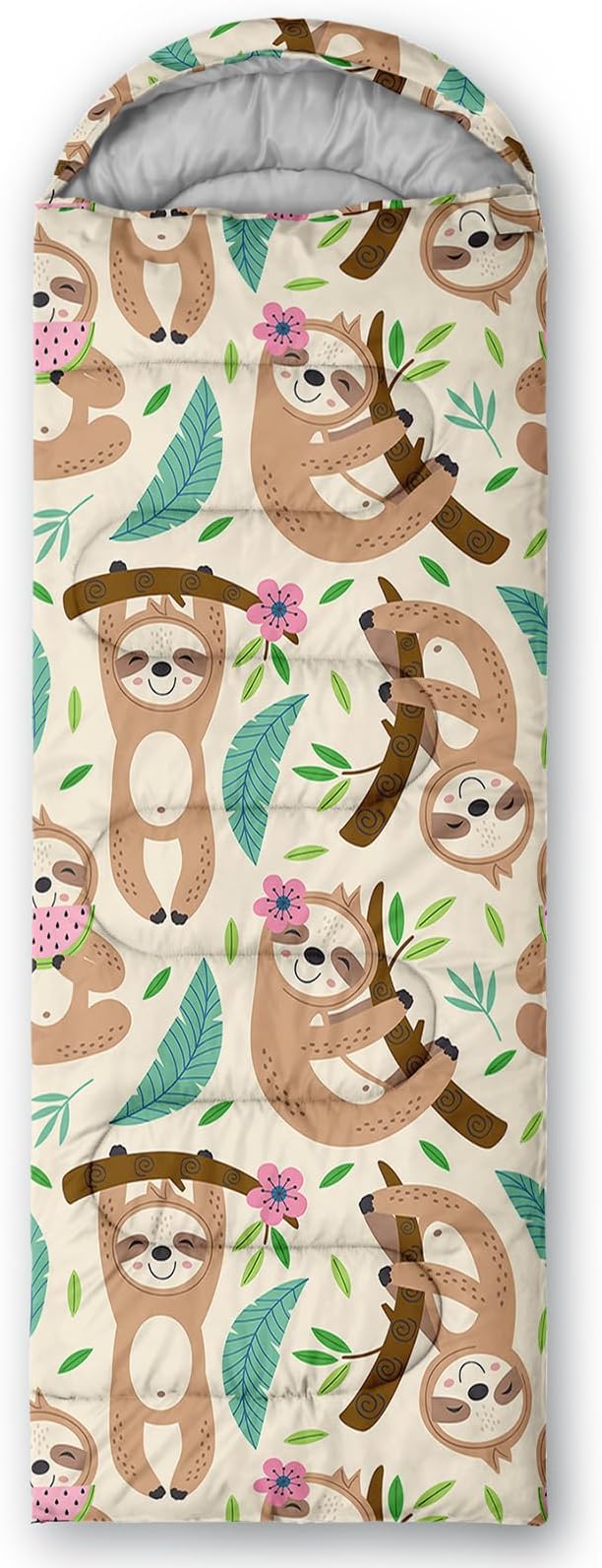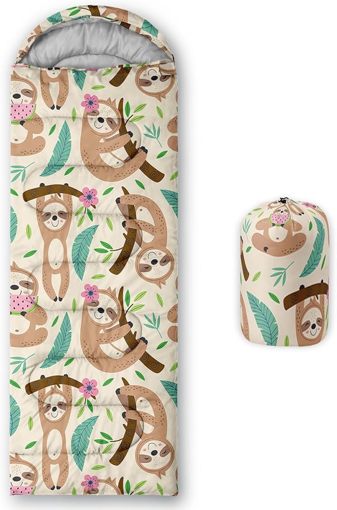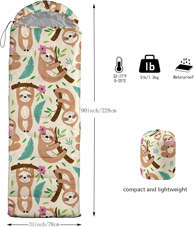 • 【Fits For 3 Seasons】: Size - 31 by 90 inches (W x D). Our Cartoon Sloth sleeping bag can be used in 3 seasons with a design temperature of 32℉-77℉(0℃-25℃). These Sleeping bags also have a weather resistant waterproof design to keep you warm and prevent you from any dampness.