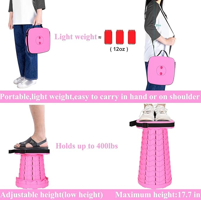• [Portable, Lightweight]: Diameter and height in the closed state are 10" and 2.56" of this collapsible stool, its weight is 2.54 lbs. You can carry it in your hand or hanging on your shoulder with the adjustable 22” straps without any burden. The collapsible stool is portable, lightweight, compact and convenient to place into luggage .