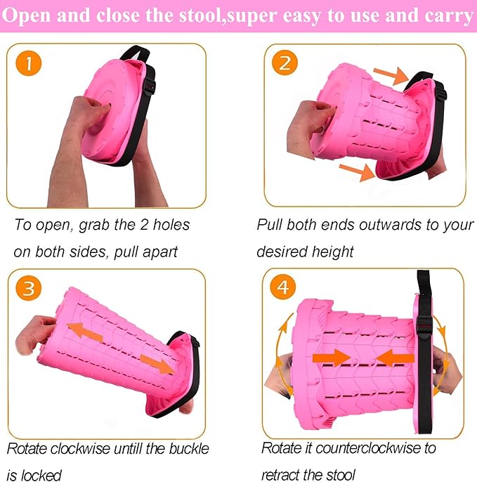 • [Easy to use, Multipurpose]: Super easy to use. You can open the collapsible stool by holding both ends and pulling to open with slight turning them, perfect for indoors and outdoors. Indoor occasions such as the living room, bedroom, bathroom, kitchen, office. Outdoor activities: drawing room, garden, hiking, BBQ, camping, queue, fishing, kitchen, etc