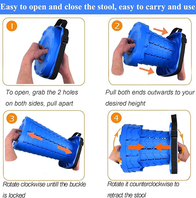 • [Easy to use, Multipurpose]: Super easy to use. You can open the collapsible stool by holding both ends and pulling to open with slight turning them, perfect for outdoors: drawing room, garden, hiking, BBQ, camping, queue, fishing, kitchen, etc