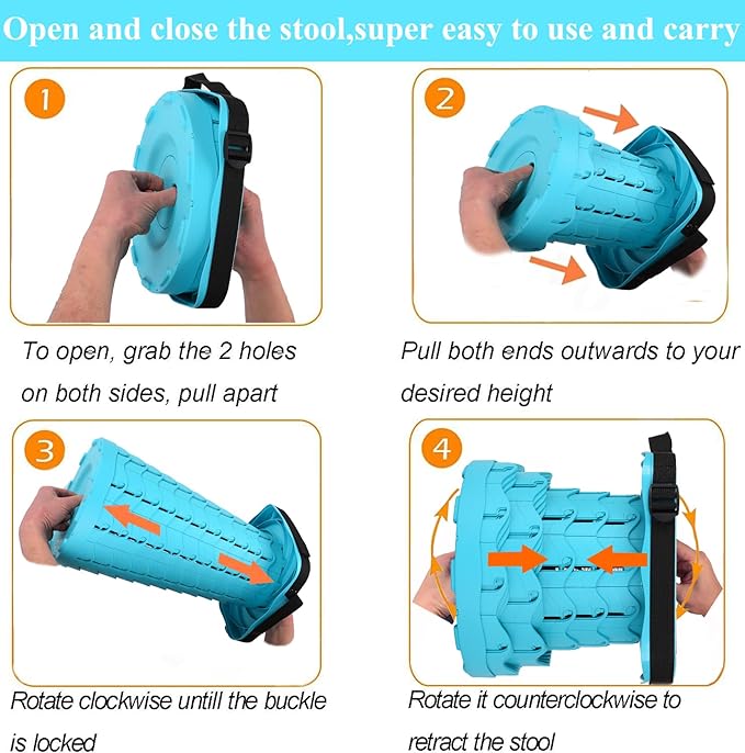 • [Easy to use, Multipurpose]: Super easy to use. You can open the collapsible stool by holding both ends and pulling to open with slight turning them, perfect for outdoors: drawing room, garden, hiking, BBQ, camping, queue, fishing, kitchen, etc