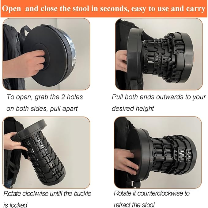 • 【EASY TO USE】: The new technique allows you to open lightweight portable stool in just 1 sec! Rotate these portable stools in a counterclockwise/Clockwise course to open or close. What's more, portable folding stool is secures solidly once opened.