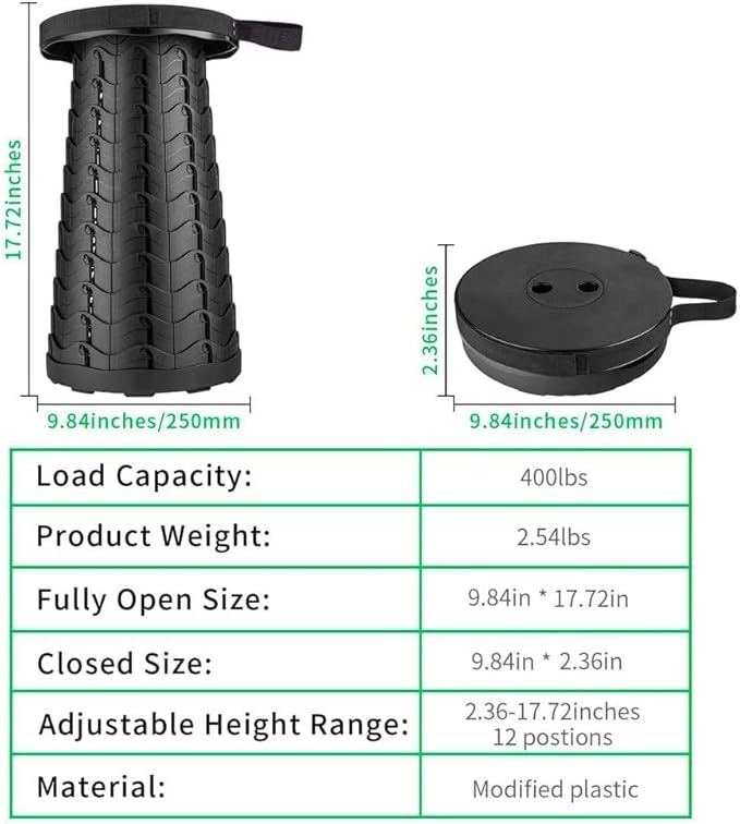 • 【Foldable,Adjustable Height,Holds 400lbs 】: Open and close the folding camping stool easily in just seconds, lock in place with slight rotation, easy installation,the height can be adjusted freely from 2.5 to 17.7 inches,applicable for both adults and teenagers.