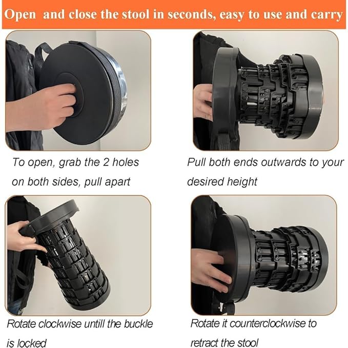 • 【EASY TO USE】: The new technique allows you to open lightweight portable stool in just 1 sec! Rotate these portable stools in a counterclockwise/Clockwise course to open or close. What's more, portable folding stool is secures solidly once opened.