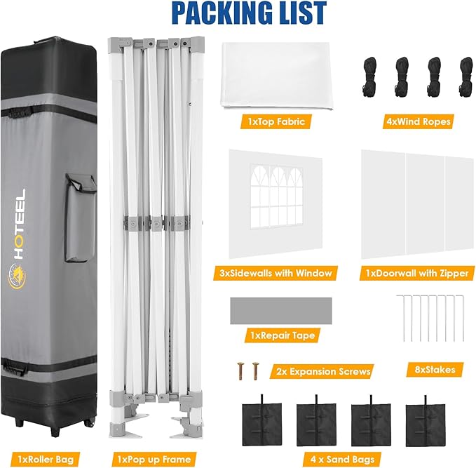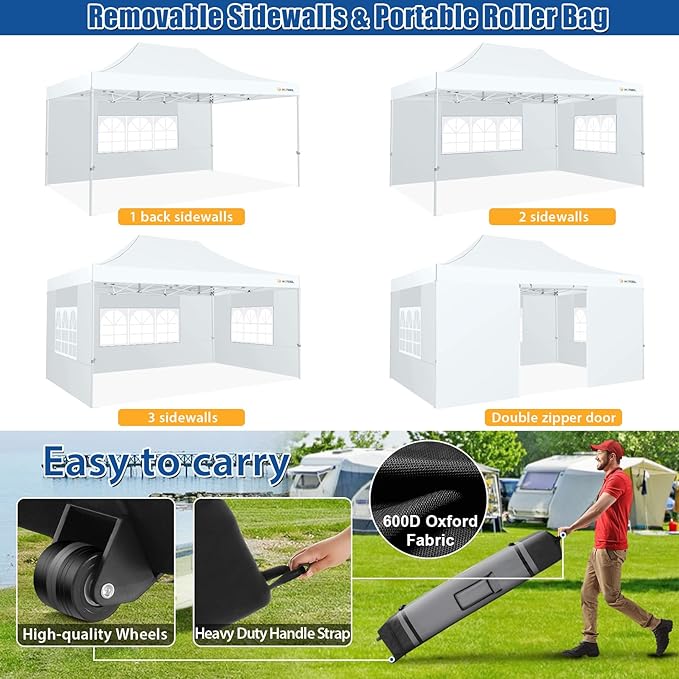 • ๐Ÿ†ใ€๐„๐š๐ฌ๐ฒ ๐€๐ฌ๐ฌ๐ž๐ฆ๐›๐ฅ๐ฒ & ๐๐จ๐ซ๐ญ๐š๐›๐ฅ๐ž ๐‘๐จ๐ฅ๐ฅ๐ž๐ซ ๐๐š๐ ใ€‘ HOTEEL 10x15 pop up canopy is easy to set up and close , no additional tool required, 1-2 people can assemble it in 1-2 minutes. And this party tent equipped with a 600D Oxford fabric portable roller bag, make sure you can take the outdoor canopy any where and stow in your car trunk easily.