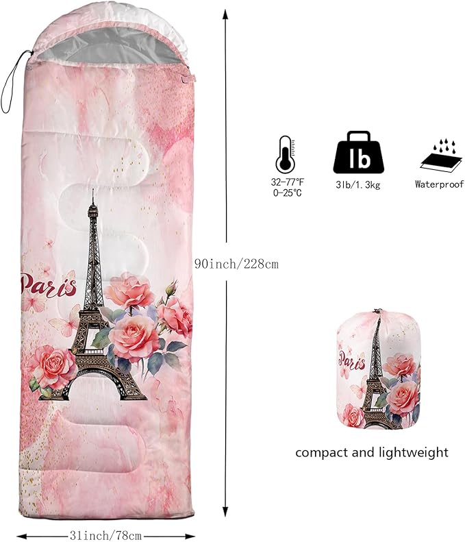 • 【Fits For 3 Seasons】: Size - 31 by 90 inches (W x D). Our Paris Eiffel Tower sleeping bag can be used in 3 seasons with a design temperature of 32℉-77℉(0℃-25℃). These Sleeping bags also have a weather resistant waterproof design to keep you warm and prevent you from any dampness.