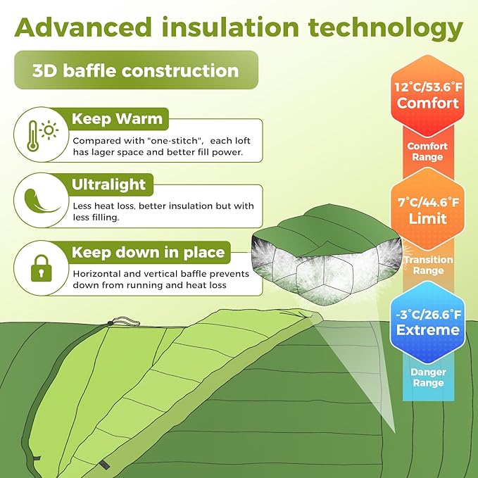 • ADVANCED TECHNOLOGY: With contrast color, this wearable sleeping bag adopts 3D baffle technology, consisting of independent insulation lofts. Each loft's down is stable and evenly distributed, effectively preventing down from running and firmly lock in heat