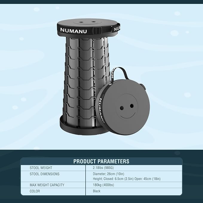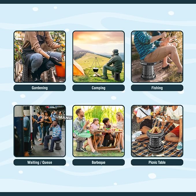 • ✨【ENDLESS OPTIONS】NUMANU Portable Telescopic Collapsible Stool has many usage options such as: Camping, Hiking, Waiting in Line, Gift, Live Concert Events, Plumbing, Construction, DIY/Fixing, Fishing, Gardening, Resting, Travel, Commuting, Bus, Train, Subway and More.