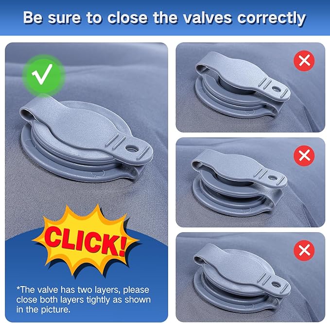 • Note:We have 2 double-layered valves on the one-piece pillow of the sleeping pad. Please close the valves tightly, and check the valves first if you find any leaking.
