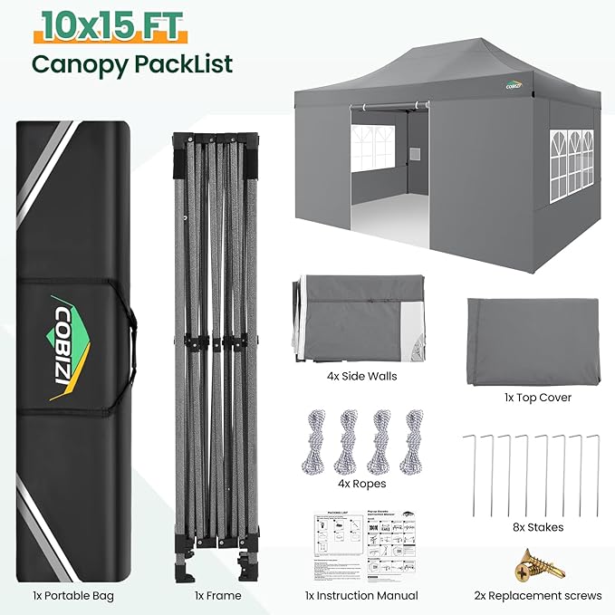 • 【Multiple Use Occasions】COBIZI 10x15 Pop up Canopy for party, parties, for home garden, play ground, yards, farm beaches, commercial area, large gymnasiums and more. Suitable for trade shows, business, art shows parties, picnics, camping, sports or any outdoor events. Even ideal for Industrial Industry, Construction, Disaster Relief & More