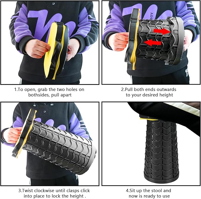 • Auto-locking and Lightweight - This retractable stool is auto-locked when closed and can easily fit into your backpack or be carried by hand or on your shoulder, thanks to the adjustable nylon strap