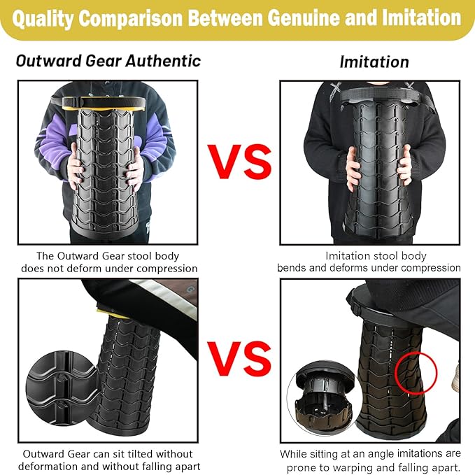 • New Design - This new Portable Stool has applied a One-Piece Structure and Upright Body design that distributes the load straight down to the base to prevent bending and breaking apart. Other collapsible stools on the market are built with sloped multi-piece pedestals connected by plastic clasps that are easily collapsed and broken into pieces