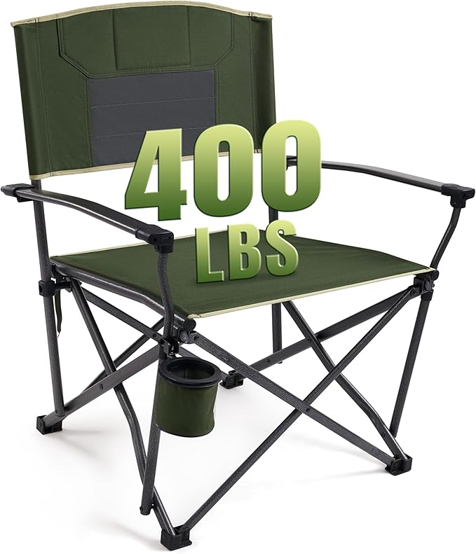 • 【Sturdy & Heavy Duty Construction】 Built to support up to 400lbs (181kg), our heavy duty camping chair features a rugged steel frame. At 22.83 x 22.04 x 19.68 inches when open, this outdoor chair provides generous seating space for long-term use. Note: Each chair weighs 14.77 lbs (6.7 kg) and has a maximum weight capacity of 400 lbs (181 kg).