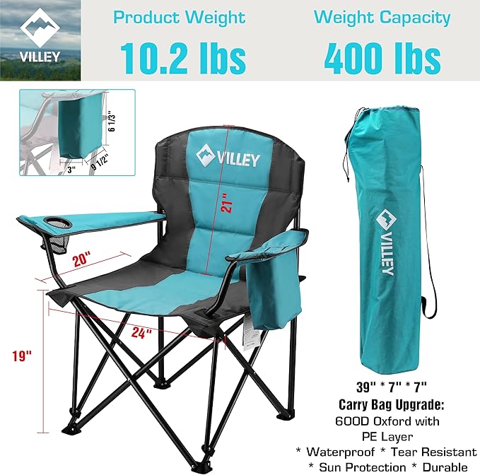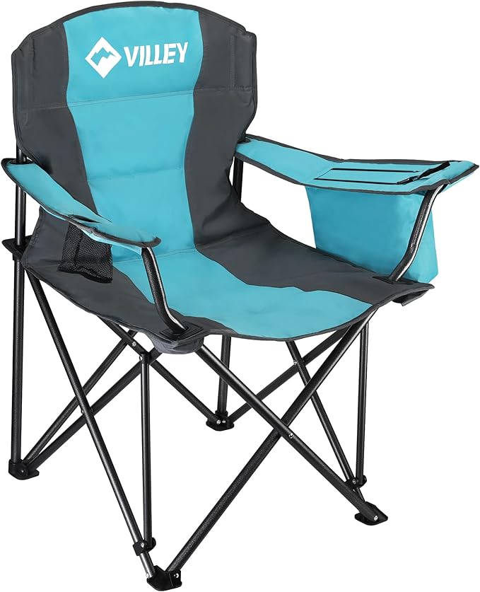 VILLEY Camping Chair, Oversized Folding Camp Chair, Portable Outdoor Chairs Support 400 LBS with Padded Seats, Cooler Bag, Cup Holder, Carry Bag, Blue