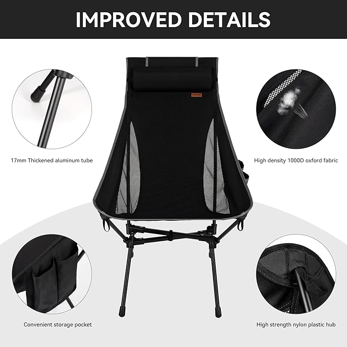 TOBTOS Portable High Back Camping Chair, Support Heavy Duty 440 lbs, Compact Folding Chair with Detachable Pillow for Camp, Hiking, Backpacking (Black)