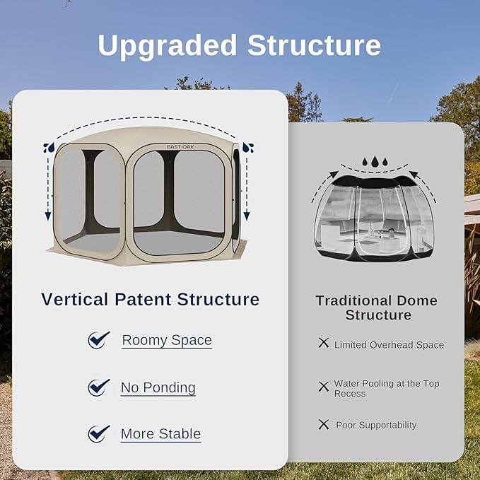 • 𝗥𝗼𝗼𝗺𝘆 𝗦𝗽𝗮𝗰𝗲 and 𝗨𝗽𝗴𝗿𝗮𝗱𝗲𝗱 𝗗𝗲𝘀𝗶𝗴𝗻: The top structure is supported by heavy-duty fiberglass, which prevents water from accumulating and delivers more space. The zipper can be used on both sides, and its connection with the tent is upgraded with doulble stitching, making it less likely to tear. The door curtain can befixed to the side for easy access