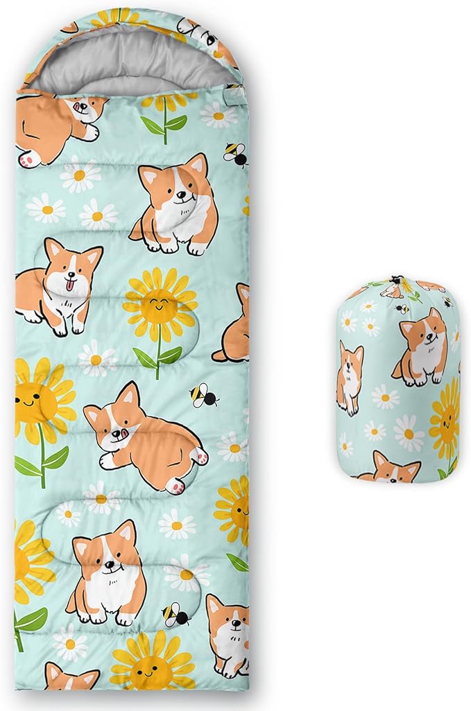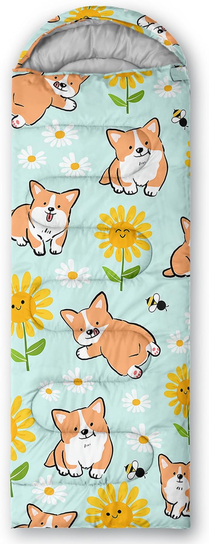 • 【Fits For 3 Seasons】: Size - 31 by 90 inches (W x D). Our Cartoon Corgi sleeping bag can be used in 3 seasons with a design temperature of 32℉-77℉(0℃-25℃). These Sleeping bags also have a weather resistant waterproof design to keep you warm and prevent you from any dampness.