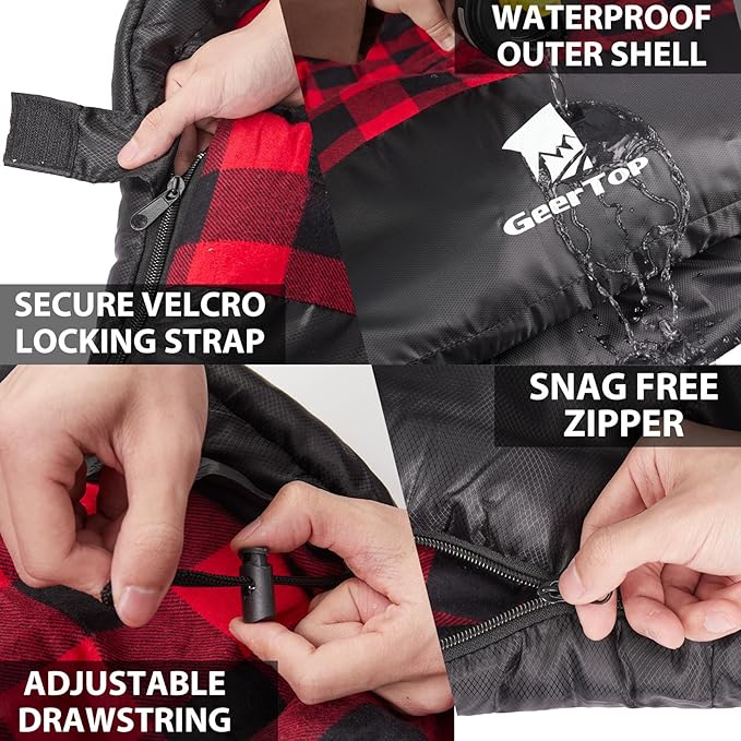 • 【Versatile as a Warm Blanket】GEERTOP sleeping bag could be an essential blanket that you can easily wrap yourself in or use as an outdoor blanket when fully unzipped. Unzip the bottom to poke your feet out without feeling constrained by the rectangular shape, offering more freedom compared to traditional mummy-style bags