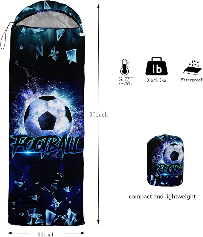 • 【Fashion Design】The sport-themed sleeping bag is made of lightweight and comfortable material,making it perfect for camping.This cold weather sleeping bag is perfect for kids who love sports,especially those who love football.It can also be given as a gift to your child.