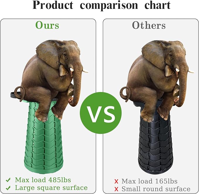 • Upgraded Square Collapsible Stool : Compared with round collapsible stool, the area is changed from 76 to 104 sq in, and the load capacity is upgraded from 397lbs to 485 lbs