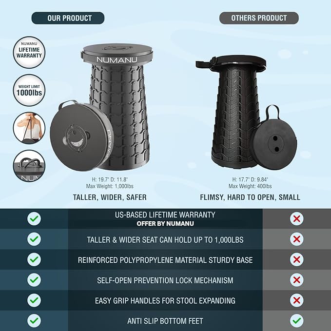 • 🆕【2025 PATENTED, TALLER & WIDER XXL STOOL】Wider, Taller, Thicker, Stronger - An XXL Heavy Duty version of the popular Portable Collapsible Stool Telescoping Chair. 19.7" Tall & 11.8" Wide surpassing other Folding Stools on the market. NUMANU, a US-based seller, provides a safe, sturdy, and comfier seating experience with Lifetime Warranty Coverage in case of any issues with your Retractable Folding Stool.