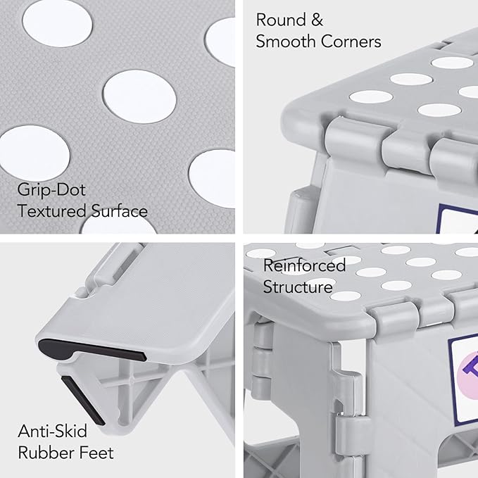 • Collapsible One-Step Stool : The grip-dot textured surface, anti-skid rubber feet design, and smooth rounded edges of this collapsible step stool makes it extra safe for children to use as they are protected from possible bruises that can result from sharp edges. It comes with a handle making it easy to carry around at home or outdoors when needed