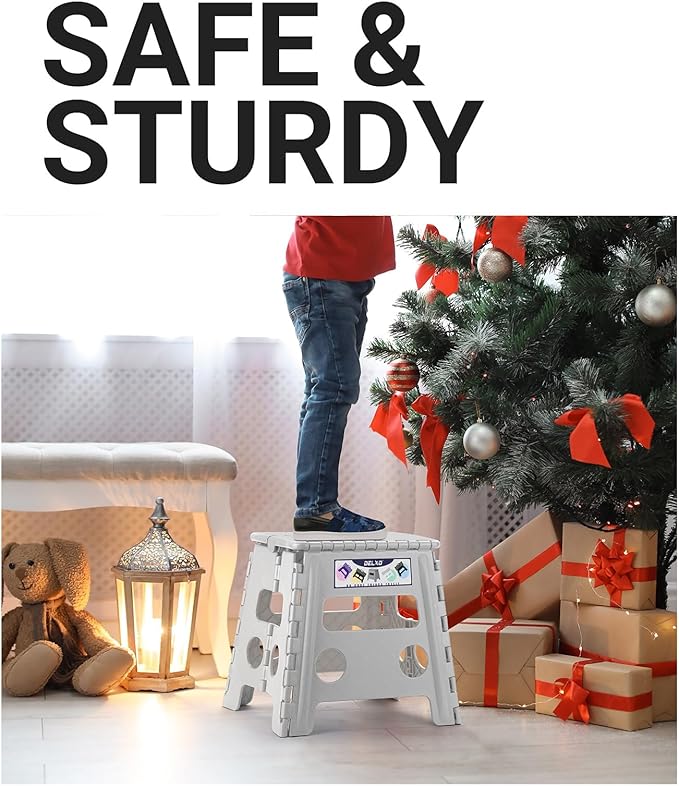 • Strong, Sturdy & Portable Stool : Our foldable, portable and easy-to-store step stool is CPC Certified. A sturdy and solid design with tight hinges makes it extra strong and safe. The folding bar adds support and prevents our non-slip step stool from collapsing when you put weight on it. For optimum safety, this stool for adults must be fully opened before use