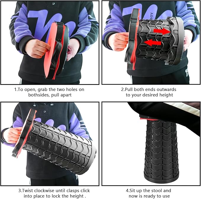 • Auto-locking and Lightweight - This retractable stool is auto-locked when closed and can easily fit into your backpack or be carried by hand or on your shoulder, thanks to the adjustable nylon strap