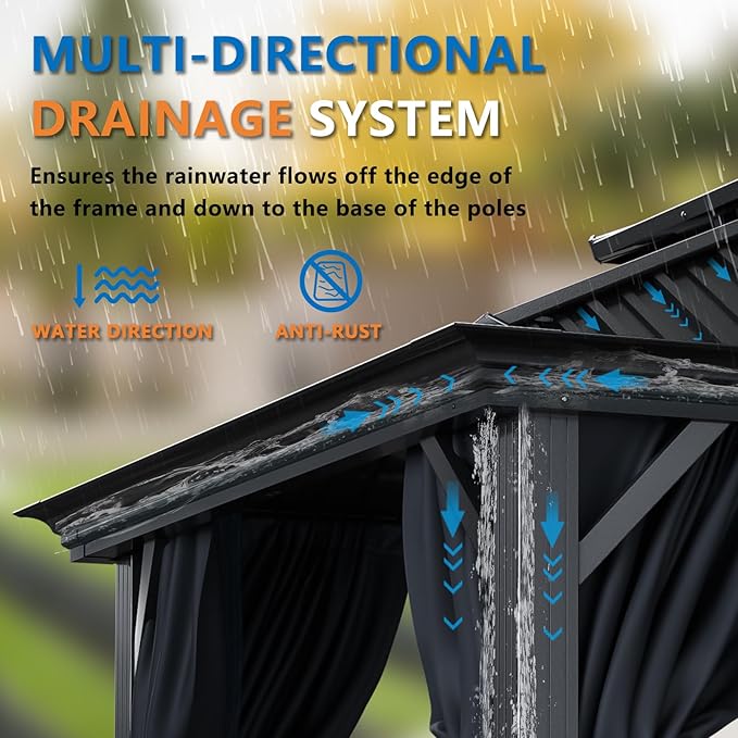 • Ventilated Double Roof: Hoteel 12x20 gazebo with metal roof features a heavy-duty galvanized steel roof that provides better protection from harmful UV rays and promotes air circulation and wind resistance. You can even sunbathe under this hard top gazebo without worrying about getting sunburned.Can withstand heavy snow loads up to 18.43 psf.
