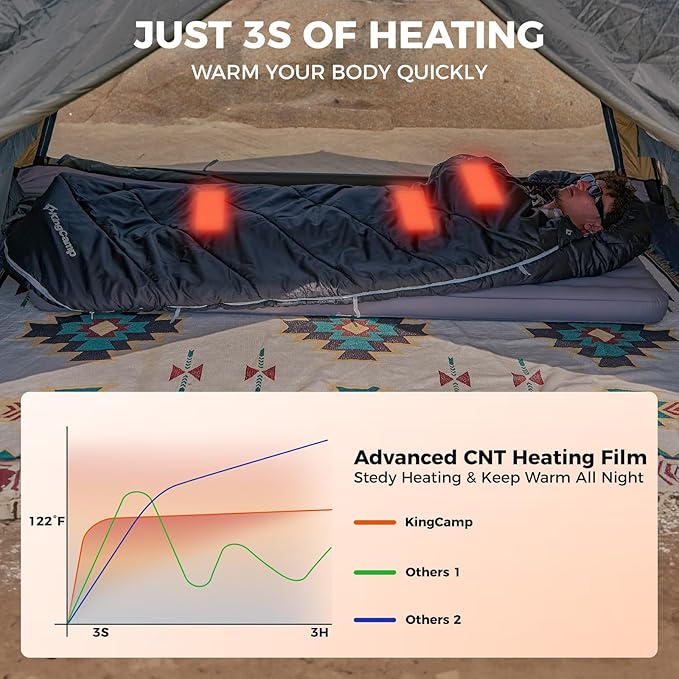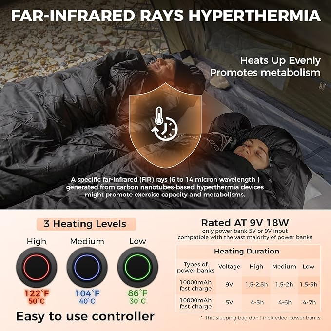 • CUSTOMIZABLE HEAT SETTINGS FOR ULTIMATE COMFORT: Choose your ideal warmth with three adjustable heat settings: 122°F, 104°F, and 86°F, all controlled via a 9V2A power source. Whether you're camping in the great outdoors or relaxing at home, adjust the temperature to suit your comfort. If the heat gets too intense, simply dial it down or turn it off – no need for an expensive down sleeping bag that might be too warm for summer nights.