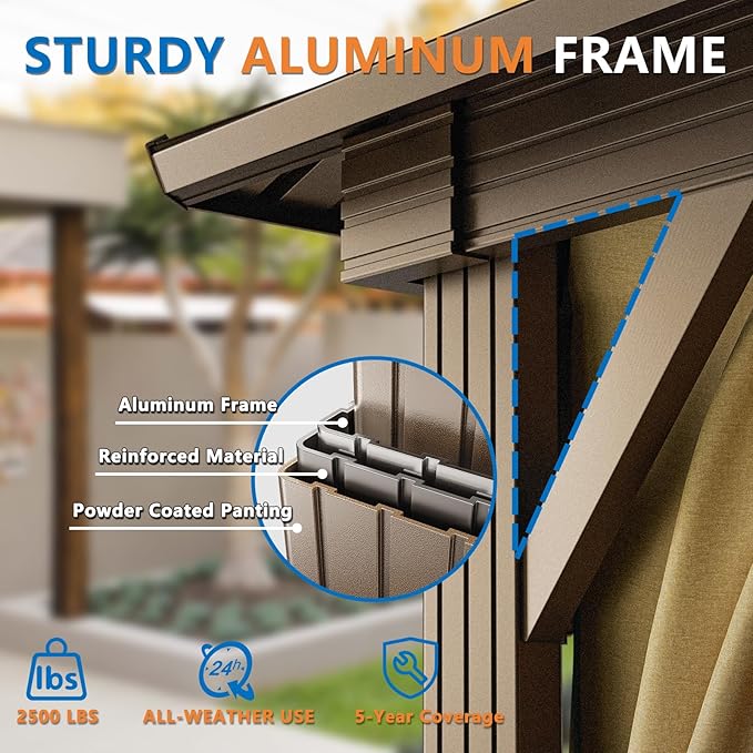 • Ventilated Double Roof: our hardtop gazebo features a heavy-duty galvanized steel roof that provides better protection from harmful UV rays and promotes air circulation and wind resistance. You can even sunbathe under this hard top gazebo without worrying about getting sunburned.Can withstand heavy snow loads up to 18.43 psf.
