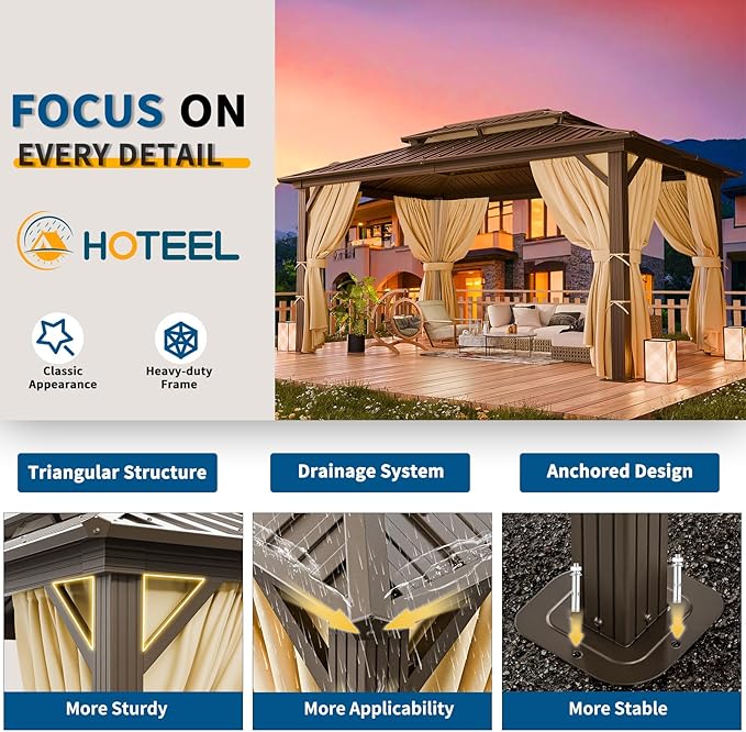 • Quick & Easy to Assemble: with detailed installation videos and manual provided for assistance, our permanent gazebo include all the necessary hardware and requires 2 to 3 people to complete installation in approximately 3 hours. Use this backyard gazebo to shade your garden, hot tub. If you have any questions, HOTEEL is here for you.