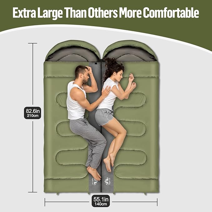 • 【More Spacious】The double family sleeping bag measures 82.68 x 55.12 inches. The double sleeping bag for camping accommodates two people to rest together and provides enough space for them to move freely, without being restricted by a narrow space, creating ideal conditions for sharing warm moments.