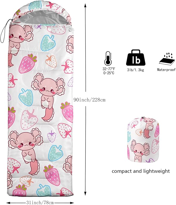 • Applicable For 3 Seasons: Our Axolotl sleeping bag can be used temperatures ranging from 32°F-77°F Except for the cold winter,sleeping bag have weatherproof to prevent from dampness,Size is 31 x 90 inches