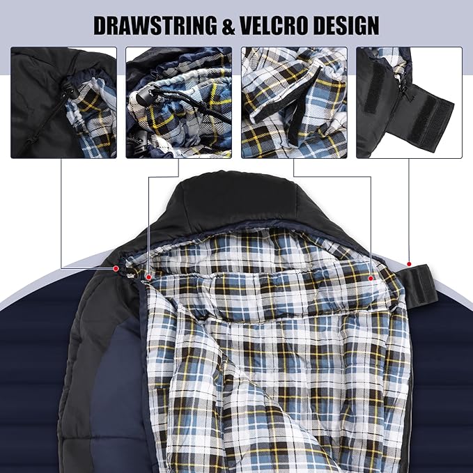 • Windproof & Insulated Design: Featuring an adjustable hood with drawstrings and a snug collar to seal in warmth, plus side Velcro to minimize drafts, this cold weather sleeping bag is specifically engineered to provide maximum insulation against the elements.