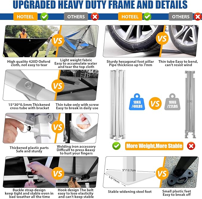 • 🏆【Packing List & Warranty Service】1xPop Up Canopy Frame, 1x 10x10 Canopy Top Cover, 4xSilver-coated Panels (2xWindows and 2xDoors with Zipper), 8xGround Nails, 4xWind Ropes, 1x Portable Bag, 1x Manual. We provide warranty service, if you have any questions with Hoteel pop up tent 10x10, please feel free to contact us. We will solve it for you immediately.