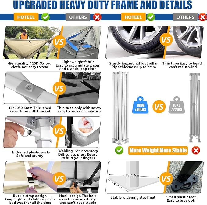 • 🏆【Upgraded Thickened Hexagonal Frame】Hexagonal pipes are structurally stronger than square pipes. Due to their shape and mechanical properties, they are less prone to deformation upon impact, offering higher stability, wind resistance, stronger support and load-bearing capacity. Upgrade thickened hexagonal pipes with a diameter of 1.77'' (45mm) and a wall thickness of 0.03'' (0.7mm), while most common party tents only have pipes with a diameter of 0.98'' and a wall thickness of just 0.02''.