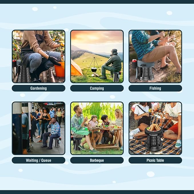 • 🔥【ENDLESS OPTIONS】The NUMANU Portable Telescopic Seat, Collapsible Stool is used by many for Camping, Hiking, Waiting in Line, Gift, Live Concert Events, Plumbing, Construction, DIY/Fixing, Fishing, Gardening, Resting, Travel, Commuting, Bus, Train, Subway and More. Take your retractable folding stool along with you!