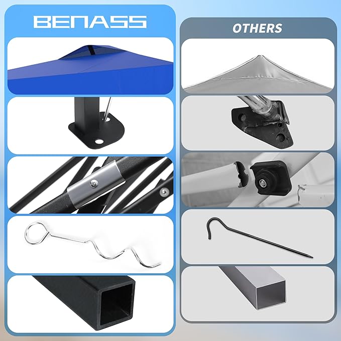 • Ideal Size & Large Room - We use straight leg design to maximize the use of space. Overall size is 10'L x 10'L x 9.2'H (8.53'-8.86'-9.2'). It's large enough for 8-10 person and enough to put tables, chairs, and others, perfect for party, camping, event and vendor
