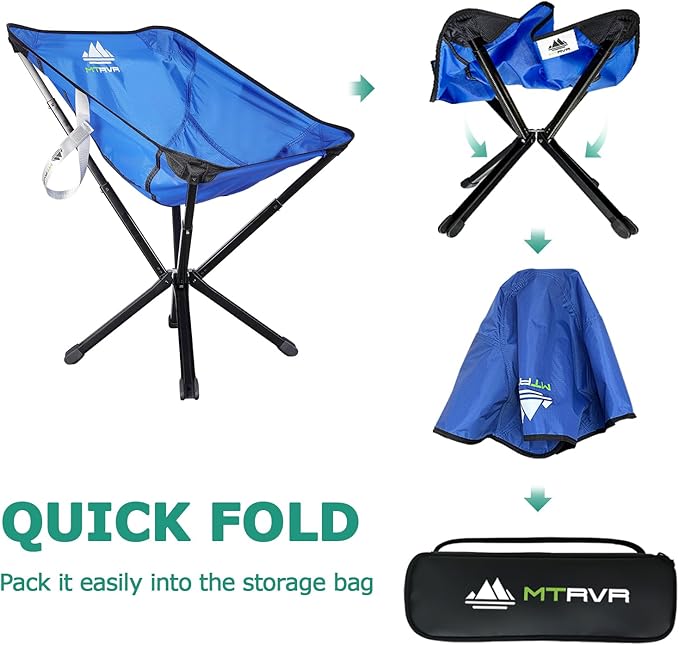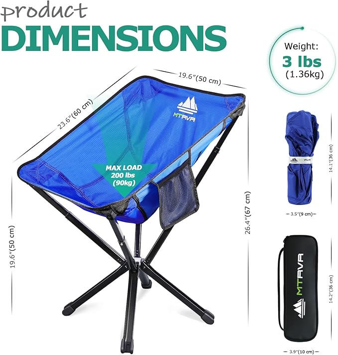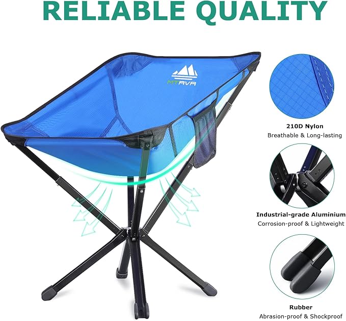 • 【High Quality Camping Chair】: The MTRVR lightweight small folding camping chair has a seamless, one-piece die-cast aluminum frame. The grooved legs support 200 lbs, premium High-Strength Nylon Fabric, this tough and breathable fabric withstands wear and tear, Suitable for women and kid use