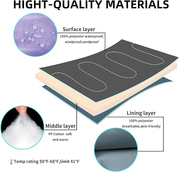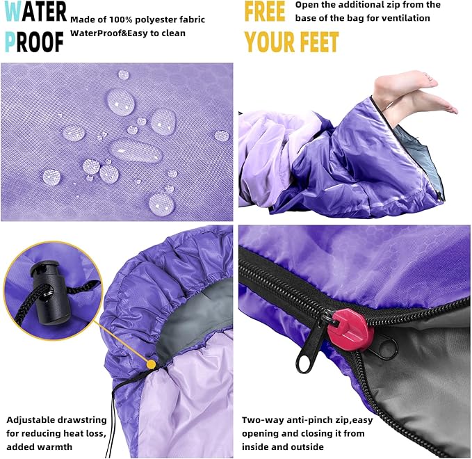 • Comfortable Sleeping Experience:Our sleeping bag can be used in 3 seasons with a design optimal comfort temperature of 59℉,temp rating 50°F-68°F.This lightweight sleeping bag is perfect for weather camping trips in Spring through to Autumn.Give you a comfortable sleep after a day of adventure outdoor camping, backpacking, hiking, and outdoor travel.