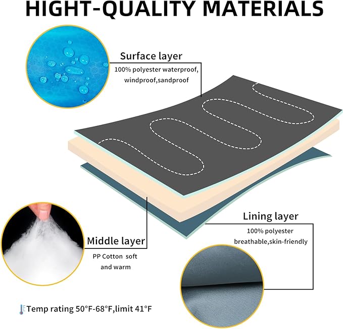 • Comfortable Sleeping Experience:Our sleeping bag can be used in 3 seasons with a design optimal comfort temperature of 59℉,temp rating 50°F-68°F.This lightweight sleeping bag is perfect for weather camping trips in Spring through to Autumn.Give you a comfortable sleep after a day of adventure outdoor camping, backpacking, hiking, and outdoor travel.