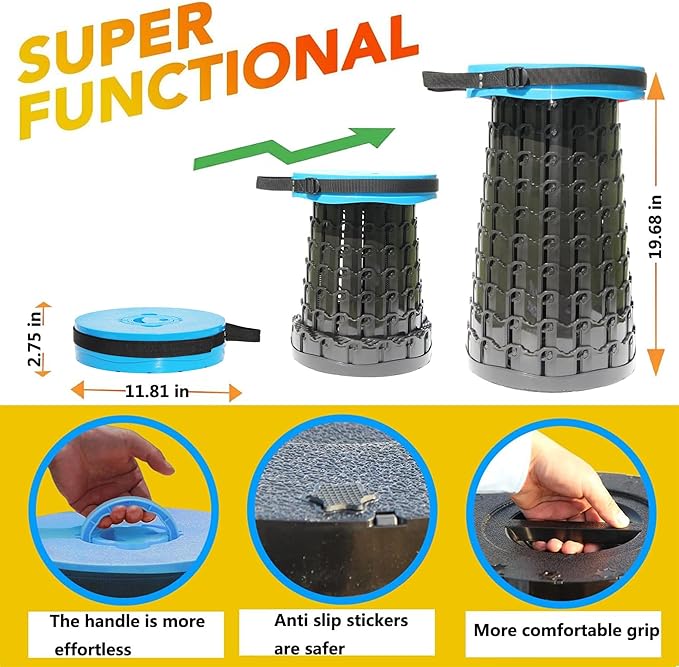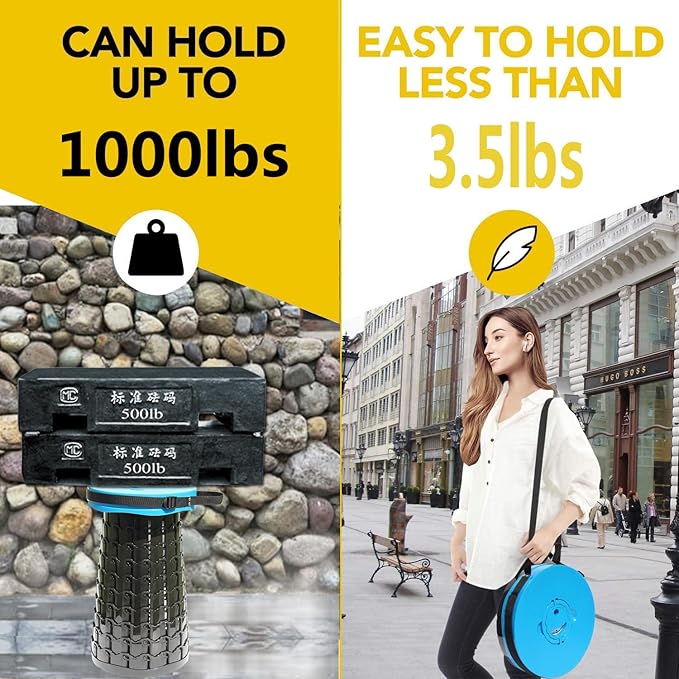 • Bigger Seat&Load Stronger:The weight of the folding stools for adults portable heavy duty is 3.5lbs BUT the load-bearing capacity can reach to 1000lbs.We increased the area of the stool surface and thickened the material.NOW the diameter of the telescoping stool surface is 11.8in. Adjustable strap attached to the sides of the stool so you can carry it in hand or hanging on shoulder without any burden. Folded size( 11.8*11.8*2.75in) does not take up much space.