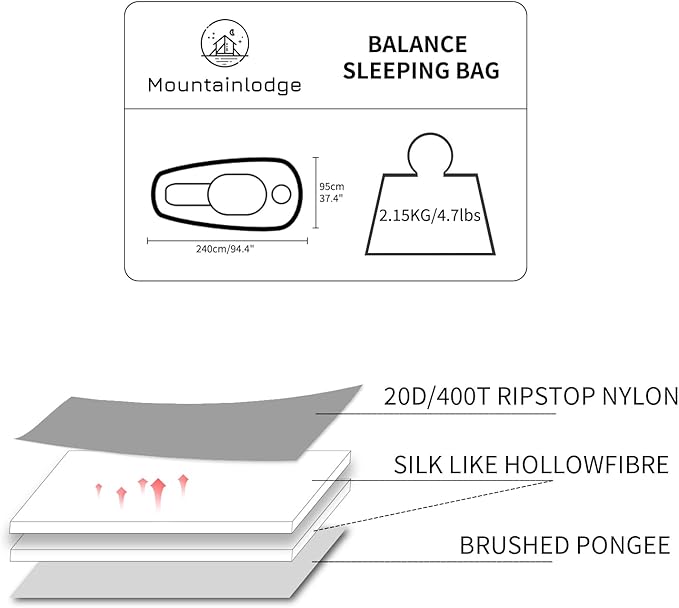 • 【Water Resistant and Skin-friendly Fabric】- Mountainlodge camping sleeping bag designed the 20D/400T RIPSTOP NYLON which can be skin-friendly and waterproof.This means that when you use this sleeping bag outdoors, it can protect you from cold environments.Not only that, this travel sleeping bag can also be used indoors. When you want to watch TV on the sofa or bed,You can put your legs in this sleeping bag to keep you warm.