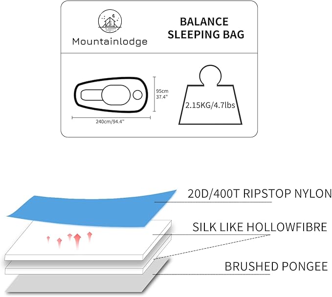 • 【Water Resistant and Skin-friendly Fabric】- Mountainlodge camping sleeping bag designed the 20D/400T RIPSTOP NYLON which can be skin-friendly and waterproof.This means that when you use this sleeping bag outdoors, it can protect you from cold environments.Not only that, this travel sleeping bag can also be used indoors. When you want to watch TV on the sofa or bed,You can put your legs in this sleeping bag to keep you warm.