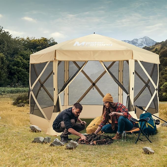 MASTERCANOPY 10x10FT Pop Up Gazebo Screen Tent - Instant Screen House with Netting, Quick Set, Outdoor Canopy Shelter with Carry Bag for Camping, Backyard & Patio (Beige)