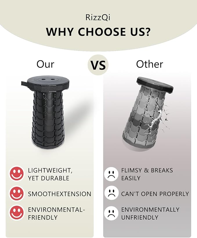 • Customizable Height for Comfort: The portable folding seat’s height can be extended from 2.5 inches to 18 inches, allowing you to easily find the most comfortable sitting position. Whether you prefer a lower seat for comfort or need additional height for various activities, our retractable stool can be effortlessly adjusted, making it ideal for the whole family.