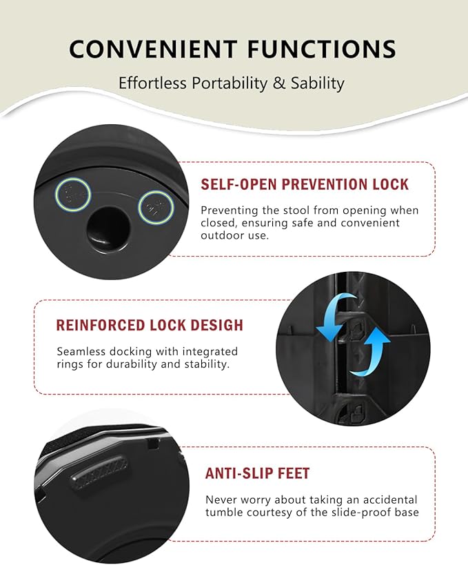 • Space-Saving Design: This collapsible stool features a retractable design that allows it to open and fold in just seconds, making it perfect for anyone who needs extra seating or support at any time. The top is equipped with a lock that secure the stool when folded, making it easy to carry during outdoor activities and convenient to take on the go.