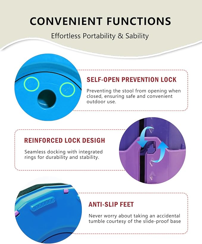 • Space-Saving Design: This collapsible stool features a retractable design that allows it to open and fold in just seconds, making it perfect for anyone who needs extra seating or support at any time. The top is equipped with a lock that secure the stool when folded, making it easy to carry during outdoor activities and convenient to take on the go.